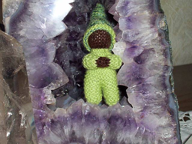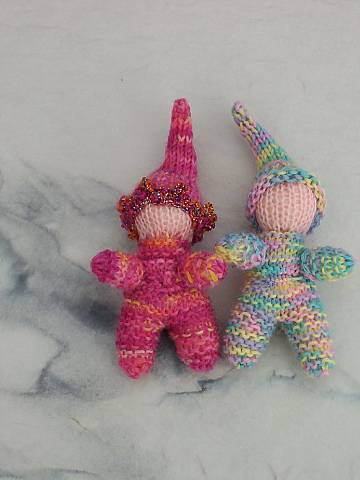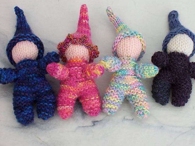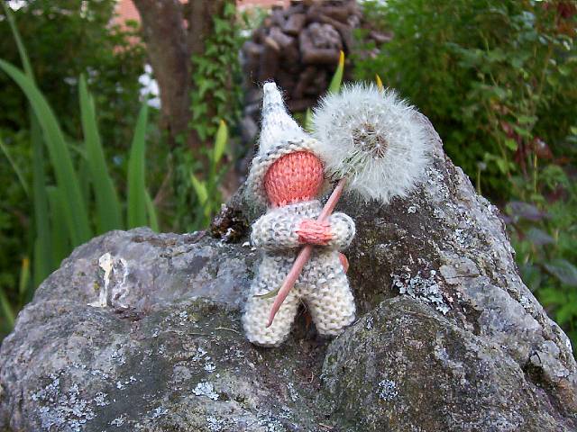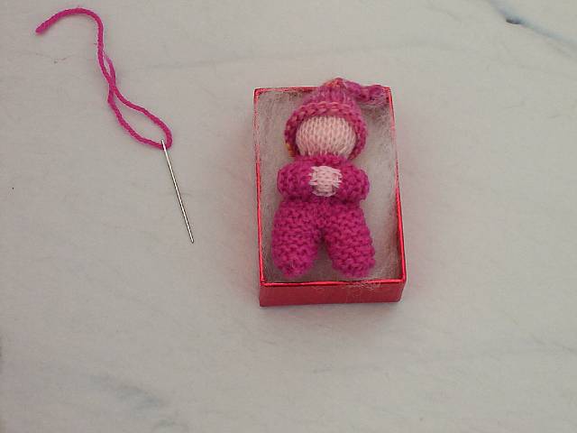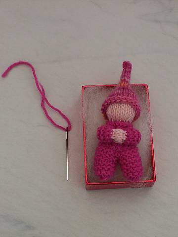 Jeg plejer også at lave en lille lommetændstikæskevugge med en hemmelig trøstedukke i. Man kan så hive i en snor og vupti åbner æsken og den sødeste dukke kommer frem bag dynen. Havde tænkt at denne lille gnom kunne bruges til sådan en. Men må lige finde tynde pinde. Måske man kan strikke på tandstikkere? Nogen, der har prøvet det? Når jeg ikke har haft tid at strikke/sy dukken, har jeg haft tegnet cirkeline, farvelagt hende og kommet hende i æsken. Det kan børn få meget tid til at gå med. De er ikke så kræsne som man tror - faktisk yderst nemme at inspirere, og inden man får set sig om har de selv lavet et helt lille lege miljø til deres lille dukke. Strikke Marie |
