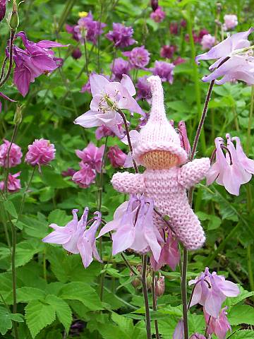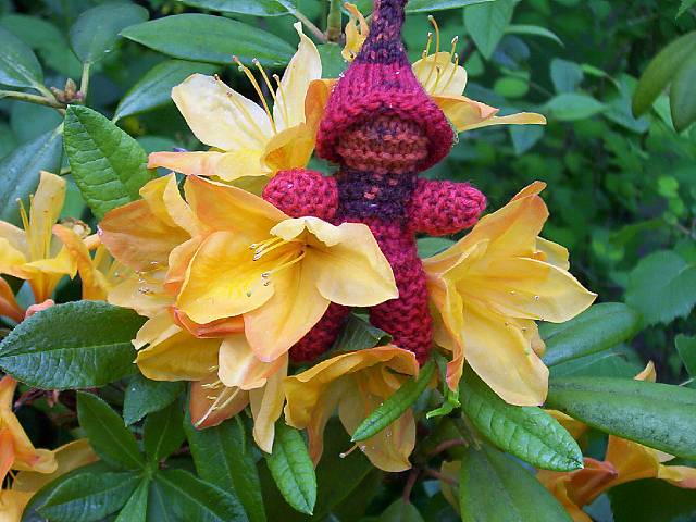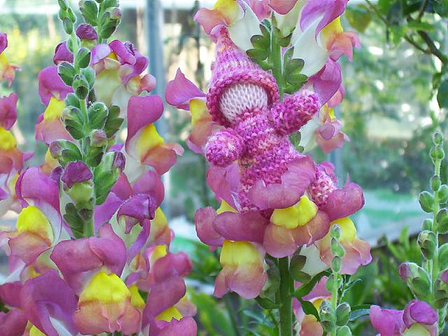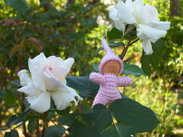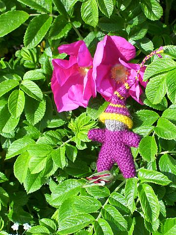 | Jeg er nu kommet i tanke om, hvad det er der er så sjovt ved at lave dukker. Der er simpelthen ikke to, der bliver ens. Enten glemmer man noget i opskriften, eller også er der ikke garn nok eller den farve man skal bruge.....listen er lang. Jeg skulle prøve mine nye tynde pinde, og skulle bare lige lave en prøve. Det gik så stærkt, at jeg ikke fik strikket nok rækker i benene, og så måtte det jo bare blive en anden. Det blev så til denne lille ven. Jeg er jo lidt doven, så jeg gad ikke rigtig sidde og fnidre med alle de endehæftninger på de små arme, og fandt på dette her. Det gik nemt. Jeg er sikker på den nok skal blive leget ihjel en dag..........selvom det var et uheld, |