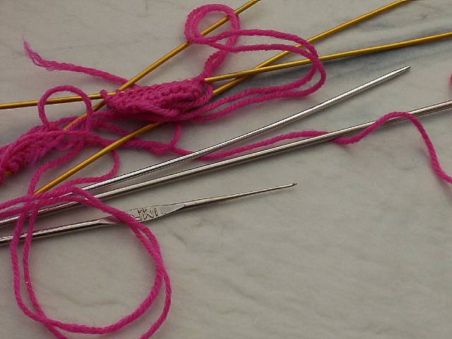 | Jeg har været lidt på indkøb. Det blev ikke til pindemadder pinde, men genbrugscenterets gemmer. Ikke mange af hver. Nogle er der kun een af, men der var nogle meget bøjede tyyyyynde strikkepinde, og en endnu tyyyyyndere hæklenål (der står 11 på den - det må være engelske mål?) - og de virker til det de skal. _ og så er de blevet til firlinger, de små. |